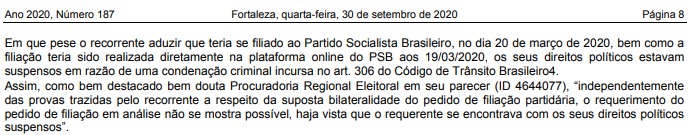 Em seu despacho, o Juiz Relator David Sombra Peixoto afirma: “o requerimento do pedido de filiação em análise não se mostra possível, haja vista que o requerente se encontrava com os seus direitos políticos suspensos”. Em outro trecho, diz a decisão: “em consonância com o parecer da Procuradoria Regional Eleitoral, conheço o Recurso interposto e NEGO PROVIMENTO para manter a sentença recorrida, mantendo o indeferimento da inclusão do nome do eleitor, ARISTÓTELES ULISSES DA SILVA BRITO, na relação de filiados do Partido Socialista Brasileiro de Jati/CE.”
